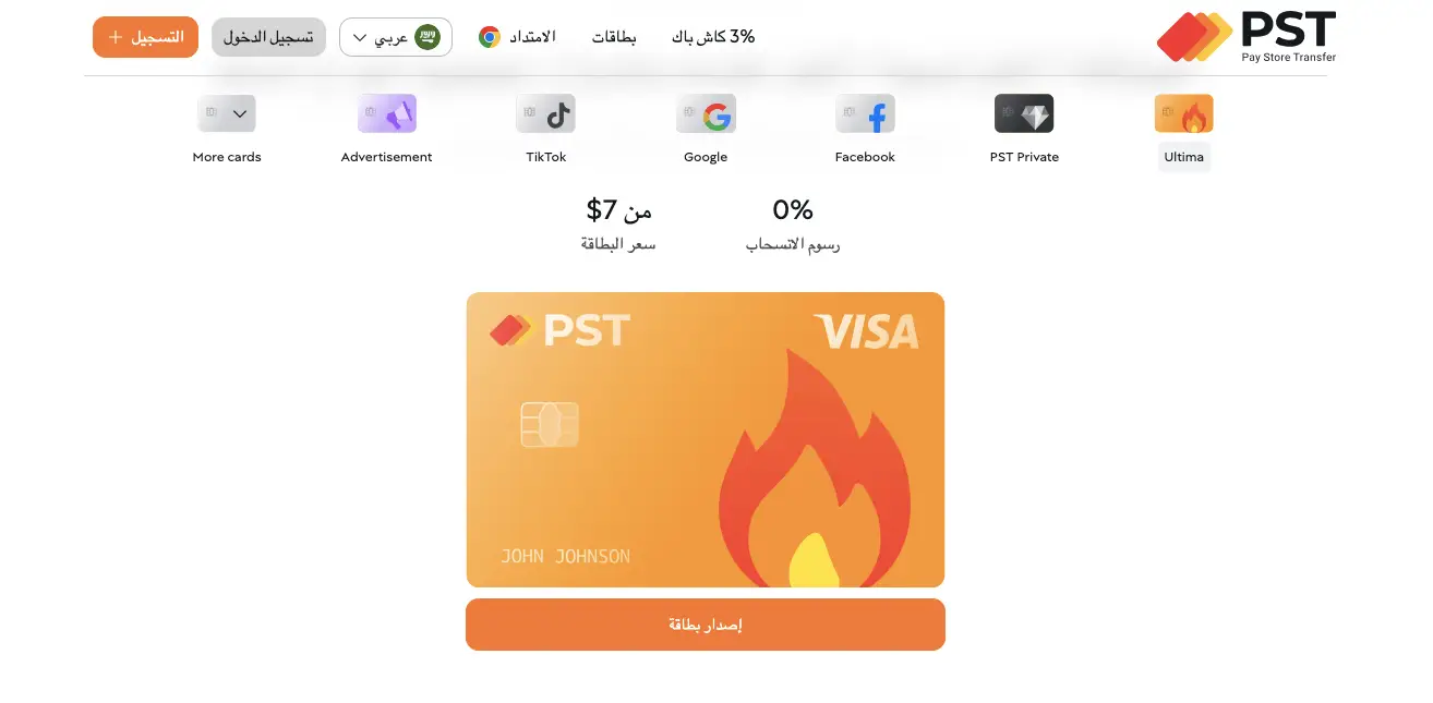 PSTNET هو أحد أشهر مزودي البطاقات الافتراضية، خصوصاً للمدفوعات عبر الإنترنت ونفقات الإعلانات. البطاقة الرئيسية للخدمة هي Ultima، وتناسب جميع المعاملات عبر الإنترنت: حجز تذاكر الطيران، شراء الرحلات البحرية، دفع الفنادق أو النفقات اليومية أثناء السفر. يعتبرها كثير من المستخدمين أفضل بطاقة افتراضية بالدولار بسبب سهولة وسرعة استخدامها.